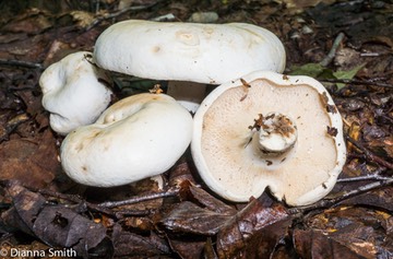 Lactarius piperatus has a large, dry, crumbly, chalky, nearly smooth, velvety cap that is depressed in the center. Its smooth margin in initially inrolled, but as the mushroom matures, it develops a funnel shape. The gills are somewhat decurrent, thin, narrow and very crowded. The latex is white. It has a peppery taste. Its spore print is white. Lactifluus piperatus is mycorrhizal with both hardwoods and & conifer trees situated in well-drained soil. The similar-looking Lactarius deceptivus has cottony inrolled margin.