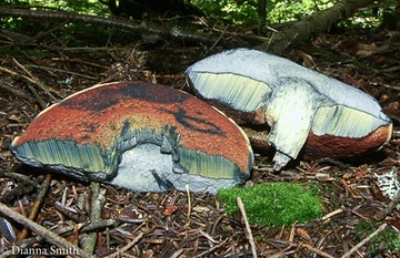 This photo of the red-pored Boletus subvelutipes shows the white flesh beneath the cap skin, and the yellow tubes and stem which have instantly turned blue on exposure to air with handling and cutting.