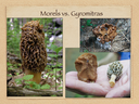 Ascomycetes. Both come out about same time in spring and often appear in same area. Several species of morels still to be sorted out: M. elata (European) (5 spp) & first to appear), M. semilibera, M. esculenta Morels are pitted and have hollow stipes. The cap is fused to the stipe. Gyromitra esculenta (Eur.), gigas (Eur.) or brunnea. Unlike morels, they are not completely hollow. They may exhibit a cotton mycelium and more stipe material. They have reddish brown, yellow, brown or brown lobed caps. Morels are found in apple orchards, and under ash and tulip poplar trees. Both morels and gyromitras may be both saprobic and mycorrhizal at various times in their life cycle. Cooking tip: Dry morels for future use. Rehydrate and cook them in cream. In Europe G. esculenta is considered edible. Yet 2 to 4% of fatalities are associated with eating them. They contain gyromitrin, which metabolizes to rocket fuel in the body. (Monomethylhydrazine) that destroys red blood cells. Period between ingestion and symptoms of vomiting, diarrhea, weakness, and headache is between 6-12 hours. Treatment is with Vit. B6. In the worst cases, patients become jaundiced, suffer convulsions, coma and death. Poisonous raw. Parboiling (2x) evaporates the active ingredient. But inhalation of fumes can be lethal. In the U.S. gyromitras may have variable amounts of gyromitrin. In the east seem to have more gyromitrin than those in the west, where they are eaten by some. It is recommended that we not eat them as in any case they are carcinogenic to at least mice. Morels and lead/arsenic poisoning from morels collected at apple orchards .013-001