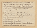 Terms: Sabropic, Parasitic and Mycorrhizal. Common Names vs Scientific Names. Labels and what they mean: Edible, Poisonous or Toxic (or Deadly), and Not Recommended. The last category is the most variable, because a mushroom that is not considered palatable in one culture may be enjoyed in another for its taste and/or texture or culturally accepted medicinal benefits. Another point to keep in mind is that even with highly prized choice edibles, like chanterelles or Grifola frondosa, individuals may not be able to tolerate them. There are also some people who can eat the mushrooms on their won, but have a reaction when consuming them with alcohol. This is not a comprehensive survey of all the edible and all the poisonous mushrooms you may encounter, but rather a introductory sampling of some of the more common edible fungi and their toxic look-a-likes. It is important to keep a proper perspective on the subject of toxic fungi. Only about 50 of the roughly 2000 that are most frequently included in field guides are listed as poisonous. Of these, far fewer still are considered fatally toxic. Rather than spend too much time worrying about whether or not the mushrooms you see are poisonous or edible, learn to identify the 50 or so toxic mushrooms and the 100-200 that are considered choice or at least worth eating. Then expand your interests to the majority of mushrooms which deserve to be appreciated for things other than there edibility: such as the role they play in their habitat. 001-001