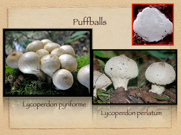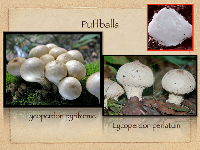 The puffballs are members of the artificial group called the gasteromycetes, or stomach fungi. Their spores are contained inside and are released through a tiny hole in the top by means of rain, wind, animals or insects. Other gasteromycetes include the false puffballs (Scleroderma and Pisolithus), stalked puffballs, bird’s nest fungi, earthstars, and stinkhorns. Except perhaps Calostoma, a stalked puffball, none are mycorrhizal.Lyco in Greek means ‘wolf’Perdon means ‘ to break wind’ therefore a common name is Wolf’s fart.Pyriforme means ‘pear-shaped’Lycoperdon perlatum grows on the ground, the other on decaying wood.Both are edible when white inside. They shouldn’t be confused with Scleroderma citrina or a death angel button.You also want to be cautious about breathing in large amounts of spores. Several years ago students from Wisconsin were told the spores were hallucinogenic. They inhaled so many that they germinated in their lungs and grew Hyphae. They were given anti-fungal drugs and their respiration returned to normal. 056-001
