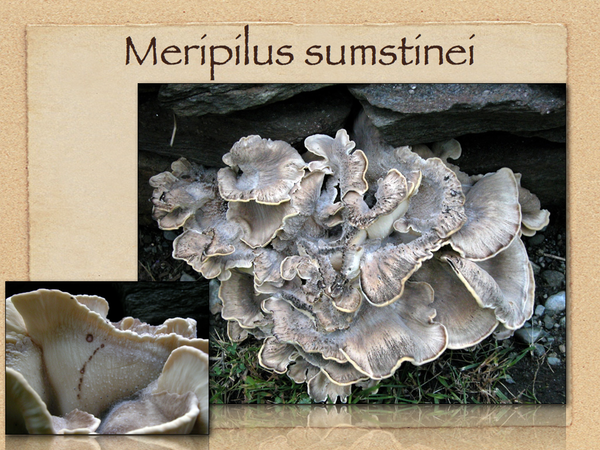 Both Grifola frondosa and Meripilus sumsteinei grow at the base of trees and cause a white rot. Likely weakly parasitic as well as sabropic. The types of wood destroying fungi encountered by pest management professionals and homeowners fall into two basic categories: brown rot and white rot. White rot attacks the cellulose and lignin in the wood giving the wood an off-white appearance. In the later stages the wood becomes spongy to the touch. White rot typically attacks hardwoods and lacks the cubical checking appearance of brown-rotted wood. Brown rot commonly attacks softwoods turning the wood dark brown. In advanced stages of decay, wood attacked by brown rot becomes friable and splits appear across the grain giving the wood a "checkerboard" appearance. Infested wood may be structurally weakened in a relatively short period of time. Once brown rot has extracted all of the nutrients from the wood the wood may become dry and powdery. This leaves the impression that dry wood has rotted (dry rot) but in reality it is an old infestation of brown rot. G. frondosa, they can appear year after year in the same location. This polypore, however, has larger lobed caps and smaller pores than Grifola frondosa. It stains black on handling. Though often confused with Grifola frondosa, both are choice edibles.Meripilus giganteus is a European species. 054-001