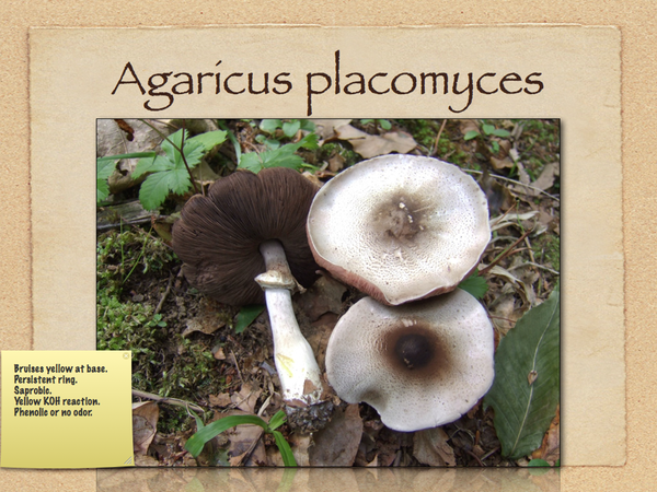 The cap center has brownish scaling. Yellowish to brownish droplets develop on underside of the annulus. Persistent ring. Bruises yellow at base.Saprobic.Yellow KOH reaction.Phenolic or no odor.The only known deadly agaricus grows in Africa, Agaricus aurantioviolaceus. 031-001