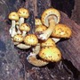This mushroom usually has a scaly cap, is slimy in some species, has pale yellowish attached gills, and often a ring. The brown spore-print will darken the gills as they mature. It can be found growing in clusters on the ground or on standing or fallen live and dead tree trunks. It appears in the autumn months of September through November.