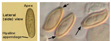 Figure 2 shows spores in a lateral (or side) view of the spore, where you can see the hyaline appendage, the attachment point of the spore to the spore bearing structure, or basidium. The other end of the spore is the apex, and in some species the apex looks cut off, or truncated. Remember that you are looking at a 3- dimensional object, and it is often necessary to understand which orientation the spore is in, because the shape can be different in different views.
