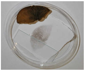 Figure 1. A spore print was made by placing part of the mushroom cap on a glass slide, and part on a piece of paper. This allows you to use the spores on the slide directly for microscopical study. J. Benson Evans