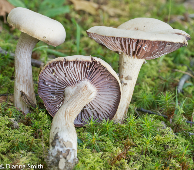Mycorrhizal with hardwoods and conifers. Appear in late summer and autumn in woods. Variable in color and shape, bearing longish stem. Cap can be lavender or tannish. Bright purple gills. Looks a lot like several robust toxic purple corts. Spore print is necessary to be certain it is white and not rust-colored, that it doesn’t have a cobwebby veil.