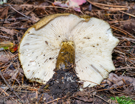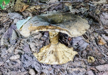 This milk cap is easily overlooked as it can be difficult to see among fallen leaves. It is similar to or the same as Lactarius sordidus. It has a medium to large zonate dingy olive-yellow-brown cap that is glabrous, has pot holes and a darker depressed disc. Its white latex stains the white to cream attached gills olive green. The stem is brownish with many scrobiculations. Spore print is dull white. Can be found in summer and fall among conifers and hardwoods. Taste is acrid. Probably a toxic species. It is in the Russulaceae family of the Russulales order.