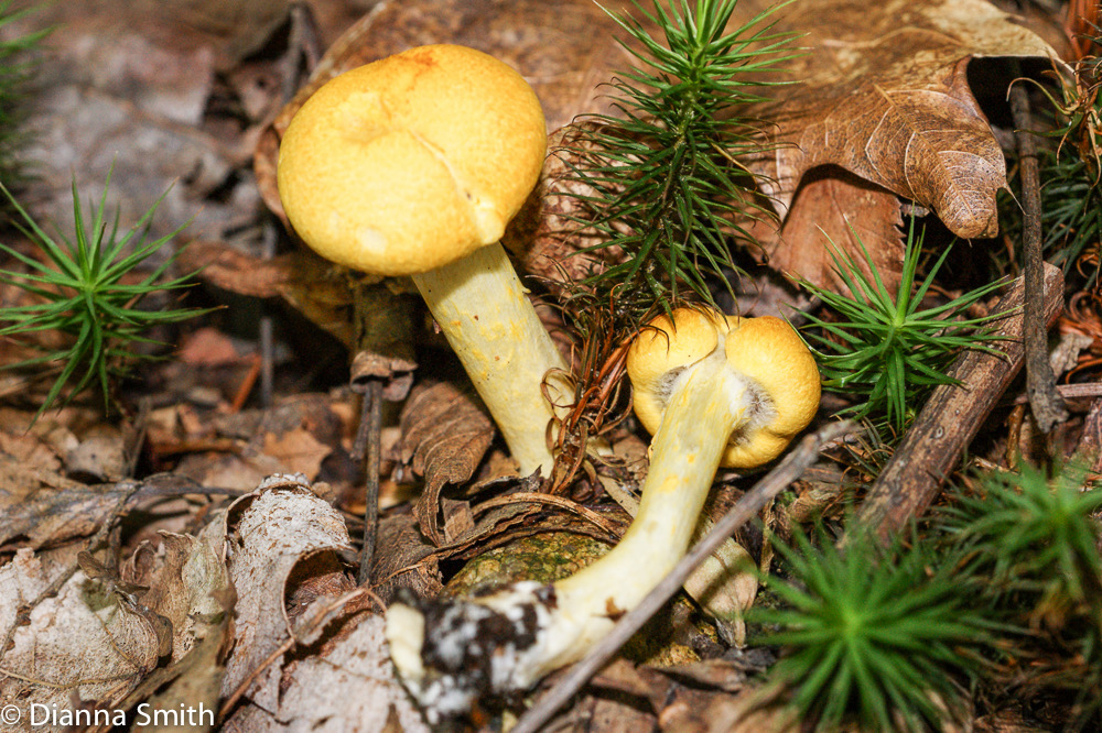 CORTINARIUS luteus has a yellow cap and yellow subdistant gills. It is found In moss in forested territory.