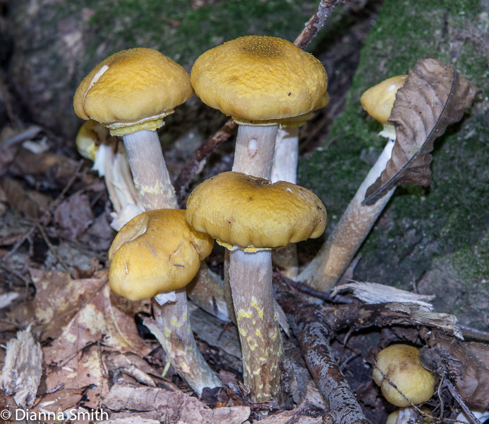 Golden universal veil leaves remains on cap and stem. Ring is yellow and fibrous.