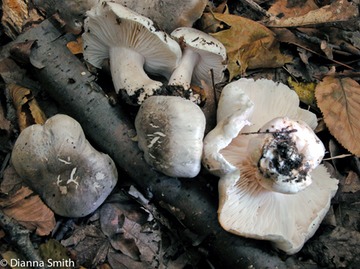 "Soapy Trich" Lead gray to olive cap with attached, whitish gills and thick stalk, pinkish at base; soapy odor. White flesh, staining pinkish near margin. White spore print. Deciduous woods. Soapy scent and pink staining stalk interior are important characteristics.