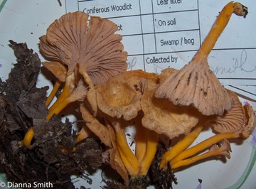 Small yellow, brownish-yellow or orange cap with depressed center that becomes perforated. Found in damp conifer woods or moss. Hymenium is pale cream or yellowish with prominent false gills.