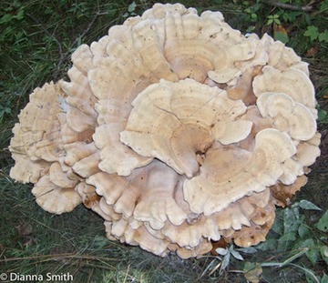 Not a true polypore! In the Russulales. Has ridged and spiny round pores like russulas and lactarius. True polypores have cylindrical or elliptical smooth spores. Pores are angular. Pore surface runs down stem and doesn't stain or bruise. White flesh. Grows at the base of deciduous trees, especially oaks. Gets quite large, up to three feet! Parasitic causing stringy butt rot of the heartwood. Also saprobic at base of dead trees. Edible when young.