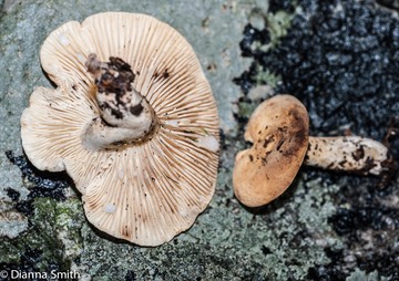 Lactarius luteolus Dry, velvety, pale buff, small cap; flesh white, latex voluminous and sticky STAINING all parts BROWN. Fishy odor. In deciduous and mixed woods with oak. Edible. Possibly losely related to Lactifluus volemus.