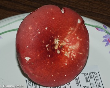"Beautiful Russula" Cap pinkish coral to peachy orange with white, cream or yellow patches. Dry matt surface, sometimes cracks. Sometimes with striate margin. Gills creamy white. STIPE with PINK tinge. Cream spore print. Can be found in deciduous woods, especially with oak. Mild.